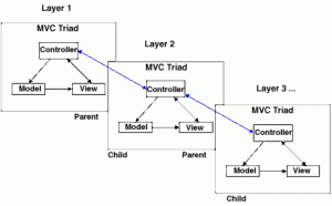 In the above diagram, each MVC component or triad can communicate externally between the controllers of other MVC triads. Thus enabling a parent-child relationship between the modules.